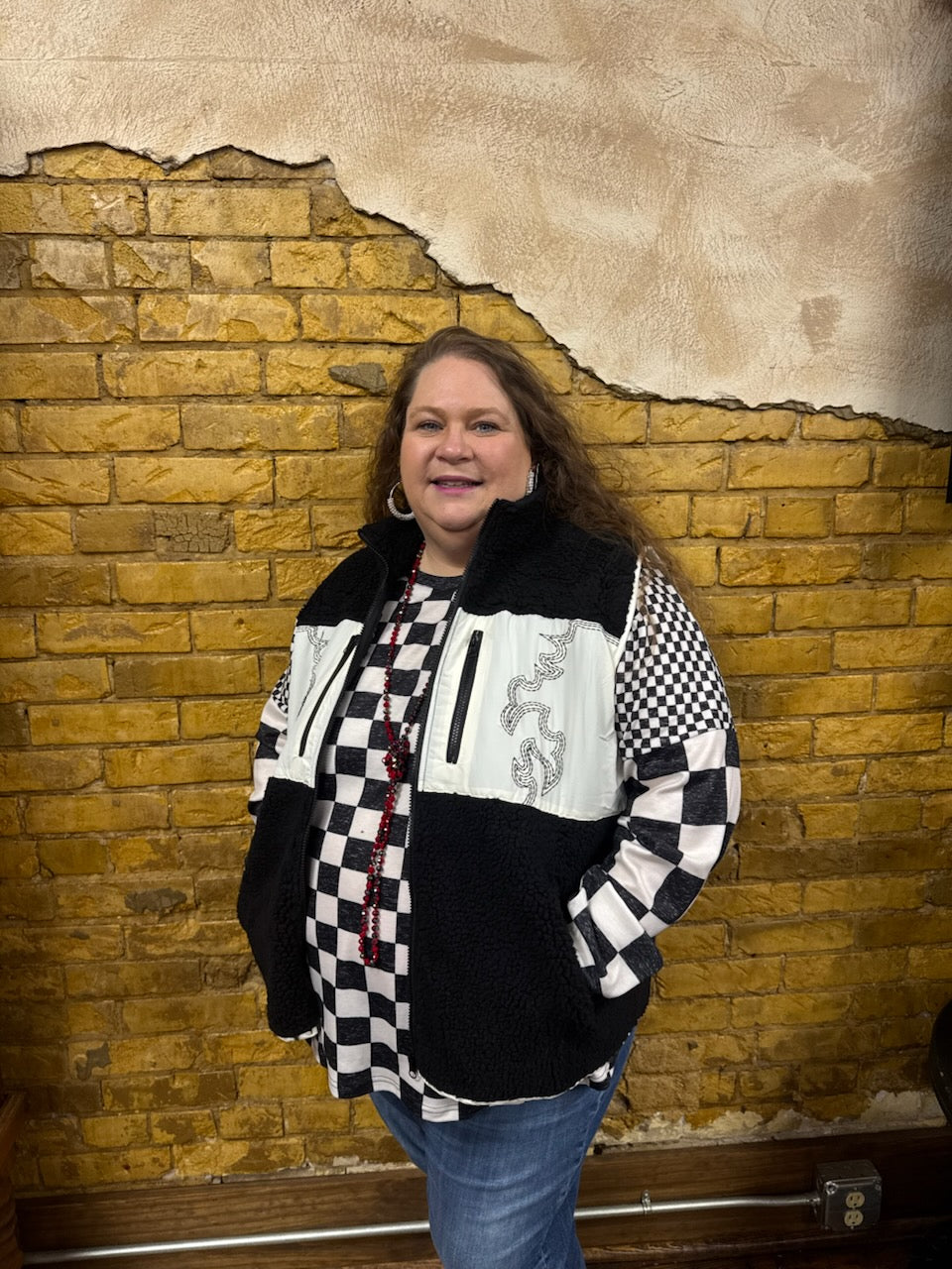 # Black and White Boot Stitch Vest Throw on rebellion. This black and white stitched vest channels raw western edge with intricate boot-inspired detailing that separates the bold from the timid. Crafted for those who wear their attitude on their sleeve, it layers over anything and transforms your look into pure outlaw swagger. The contrast stitching catches light and turns heads—because blending in was never an option. Wear it like you mean it.